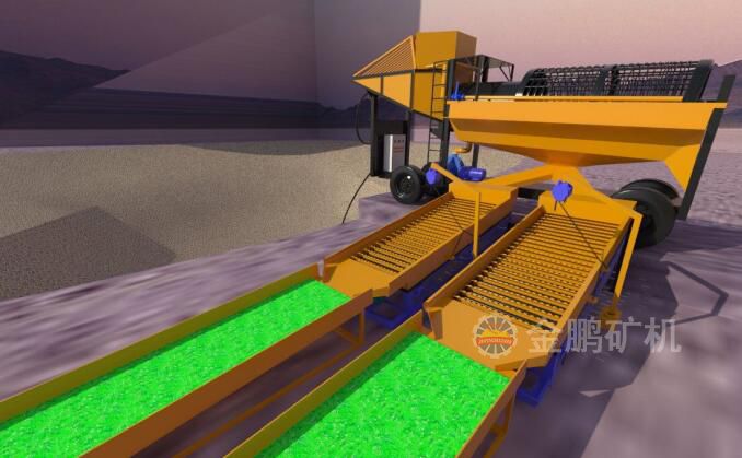 原礦通過礦用自卸車運輸到選金車礦倉,礦倉上設有格篩防止大塊礦石進入到分級洗礦篩對篩子造成危害,礦石在篩子內通過高壓水的沖洗使礦石、泥土、顆粒金分開。篩上產品通過皮帶運輸機直接運輸到廢料堆廠,篩下產品經過鼓動溜槽先進行富集,然后再自流至固定溜槽進一步回收有價金,通過兩次選別作業顆粒金的回收率可高達70%以上。我公司生產的移動式砂金選礦車解決了原來固定式運輸成本高的弊病更適合旱地選金。